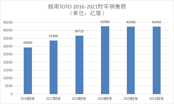 數(shù)據(jù)顯示,TOTO近年在越南的銷(xiāo)售額整體平穩(wěn)。2019財(cái)年突破40000億盾(約人民幣12.00億元)后,2020、2021財(cái)年均在42000億盾以上,其中2021財(cái)年還是越南疫情反彈較嚴(yán)重的一年,這一年TOTO在越南的營(yíng)業(yè)利潤(rùn)大幅減少65%。不過(guò),正如TOTO建設(shè)第四工廠不僅為了越南市場(chǎng),近年越南工廠的產(chǎn)品也大量出口海外市場(chǎng)。以2021財(cái)年為例,這一年TOTO在越南的銷(xiāo)售額為42440億盾(約人民幣12.73億元),其中外部顧客銷(xiāo)售額達(dá)到14390億盾(約人民幣4.32億元),占比超3成。