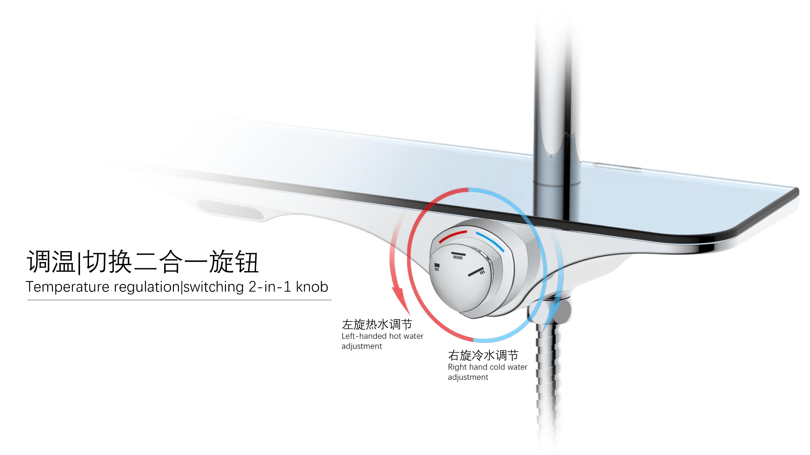 隱藏式下出水;仿山水大平臺(tái)置物;旋鈕切換三種模式出水