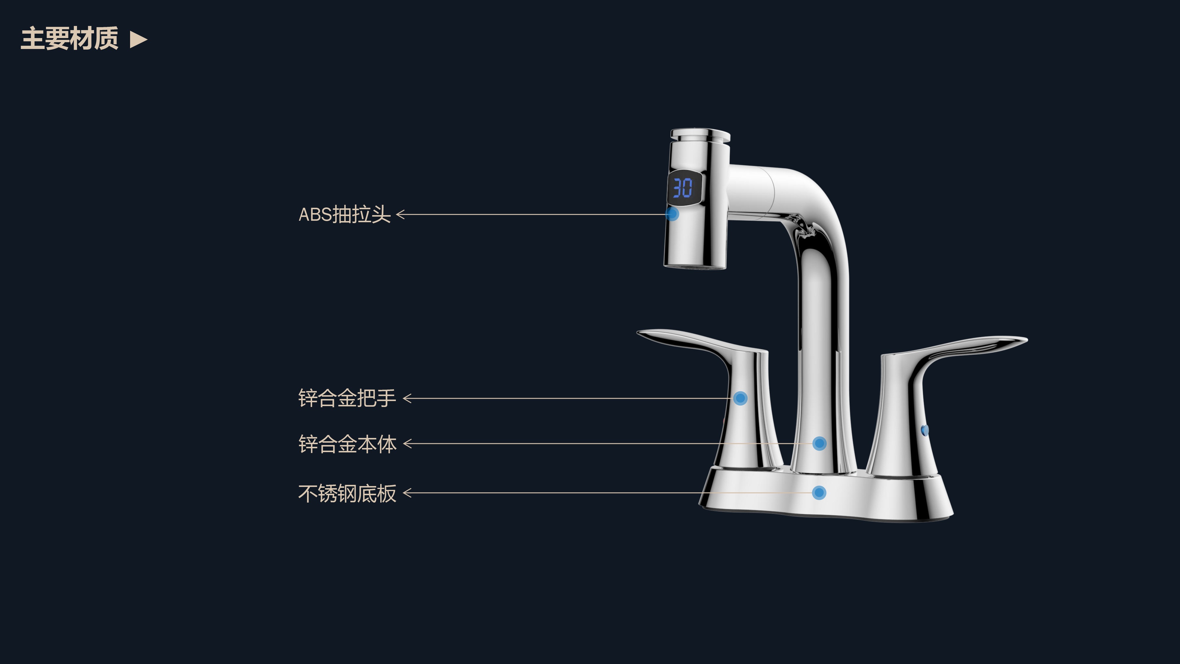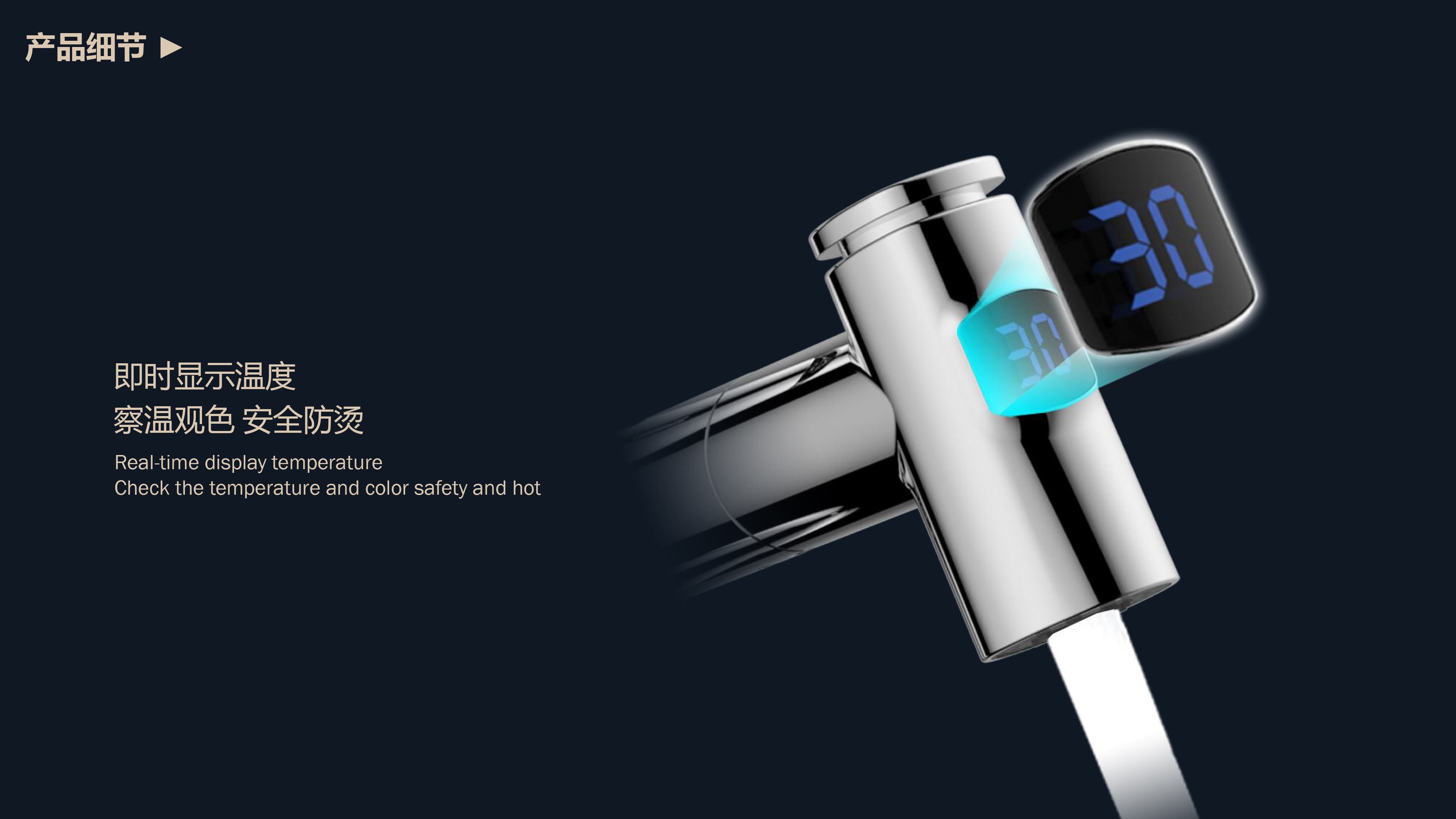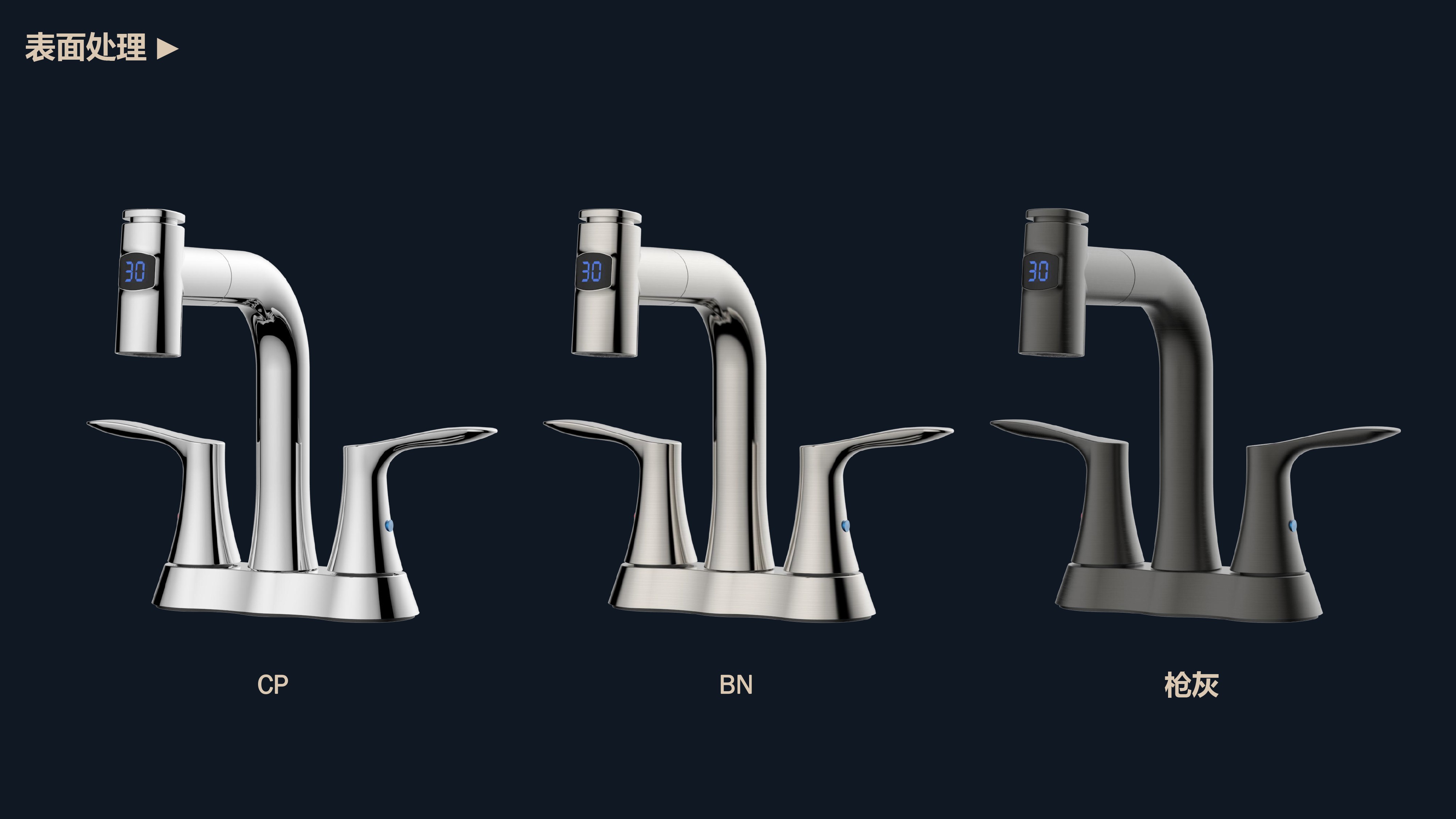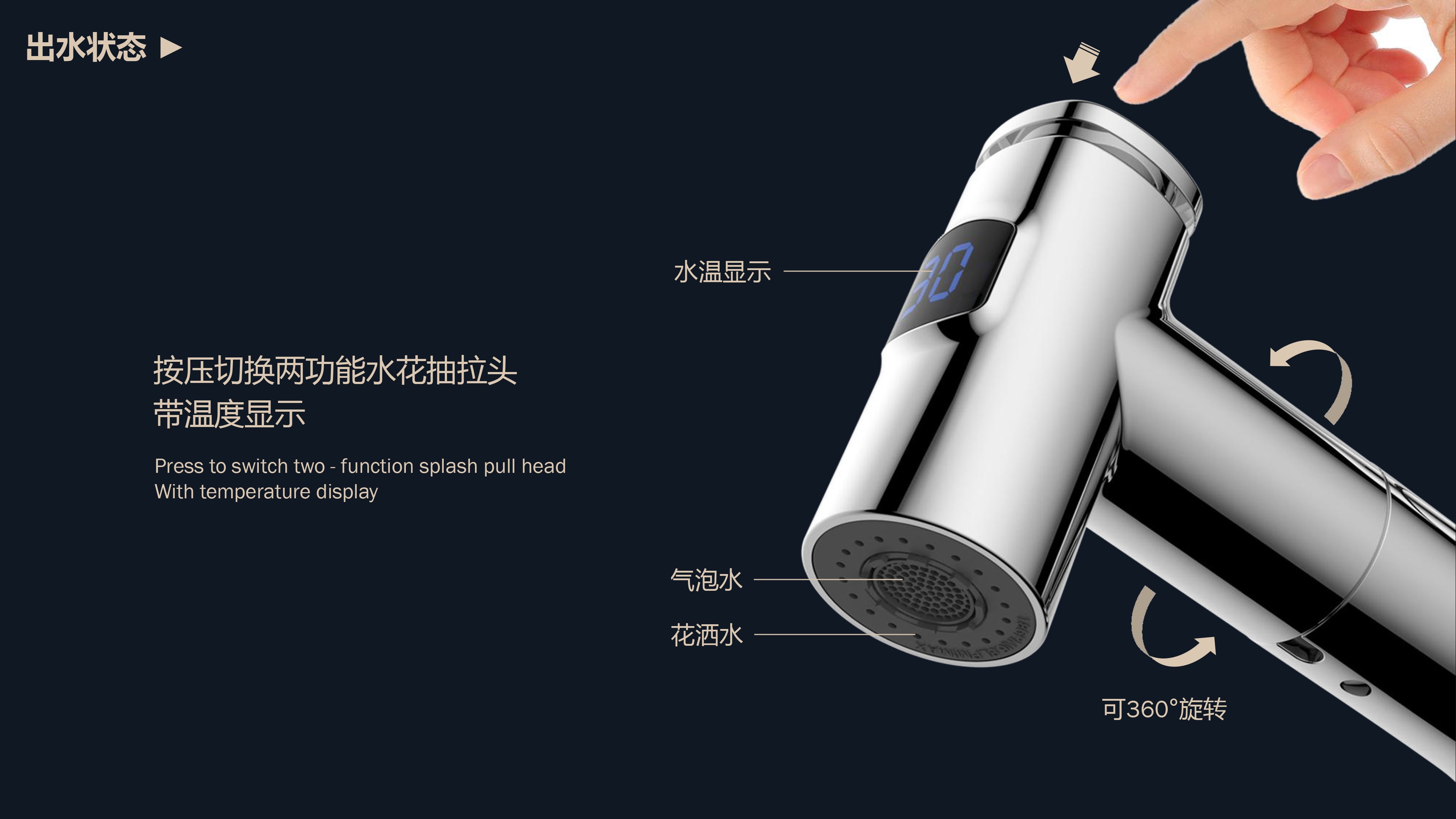 即時顯示溫度,安全防燙;日常洗頭利器,抽拉出水輕松洗;按壓切換兩功能水花;適合4寸3孔安裝臺面